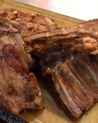 Uzený bok. Výrobek zapáchal po kažení a měl vybledlou barvu. Potravina se nepovažuje za bezpečnou, pokud jeví známky kažení. Můj obchod Potraviny HOAS, září 2022.