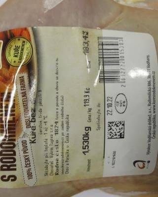 Kuře s rodokmenem, Vodňanská drůbež. Výrobek zapáchal po kažení a měl nazelenalou barvu. Potravina se nepovažuje za bezpečnou, pokud jeví známky kažení. Při kontrole nebyly zjištěny nevyhovující teploty skladování tohoto výrobku. Potravina neměla prošlé datum použitelnosti. Tesco Brno, říjen 2022