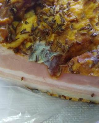 Uzený bok kmínový. Na povrchu potraviny se vyskytovala plíseň okem viditelná. Potravina se nepovažuje za bezpečnou, pokud jeví známky kažení. Při kontrole nebyly zjištěny nevyhovující teploty skladování této potraviny. Potravina neměla prošlé datum použitelnosti. Vzorek byl odebrán z načatého balení. Konzum Sopotnice, červenec 2022