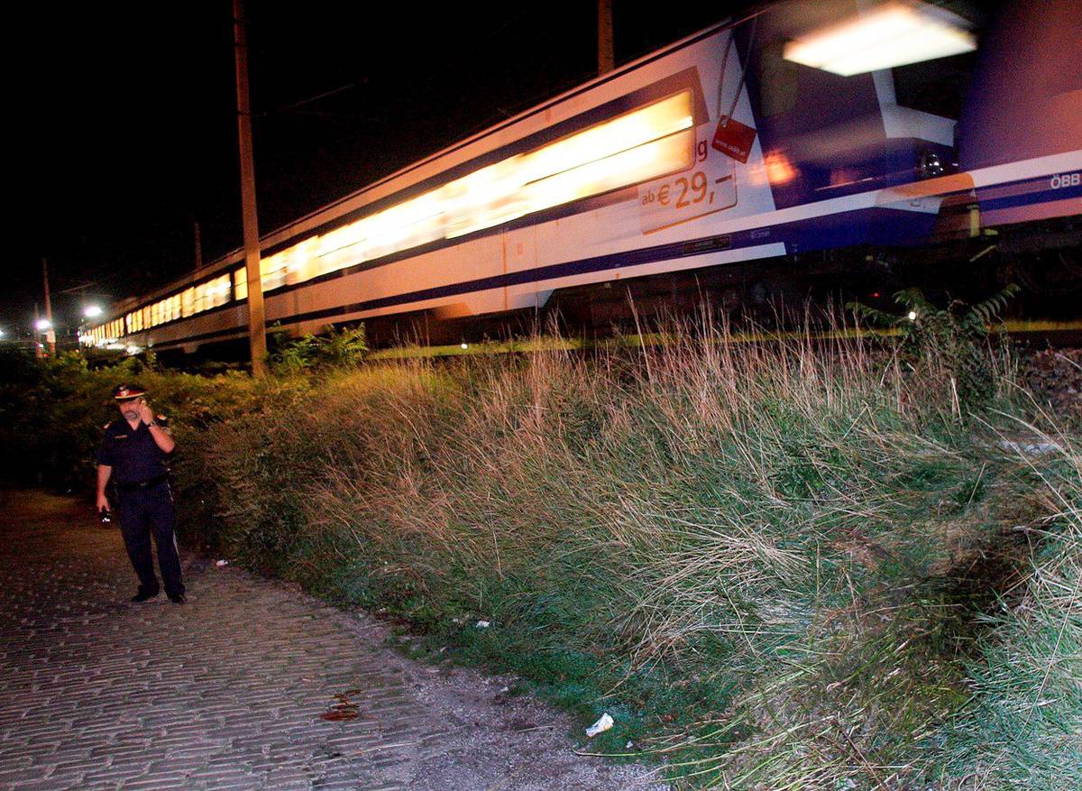 Policisté a novináři blízko místa, kde Priklopil spáchal sebevraždu.