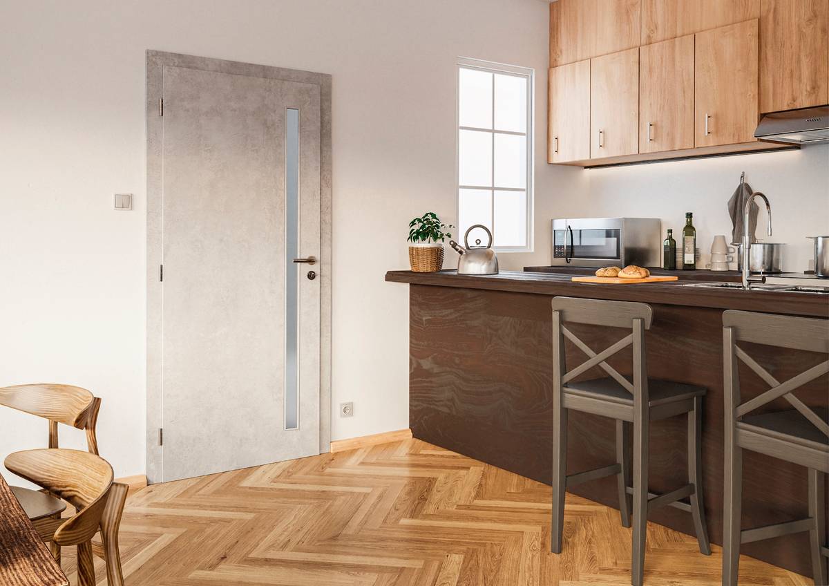 Dveře Gabreta se šedým CPL povrchem vynikají atypickým prosklením, které může být zaoblené či rovné.