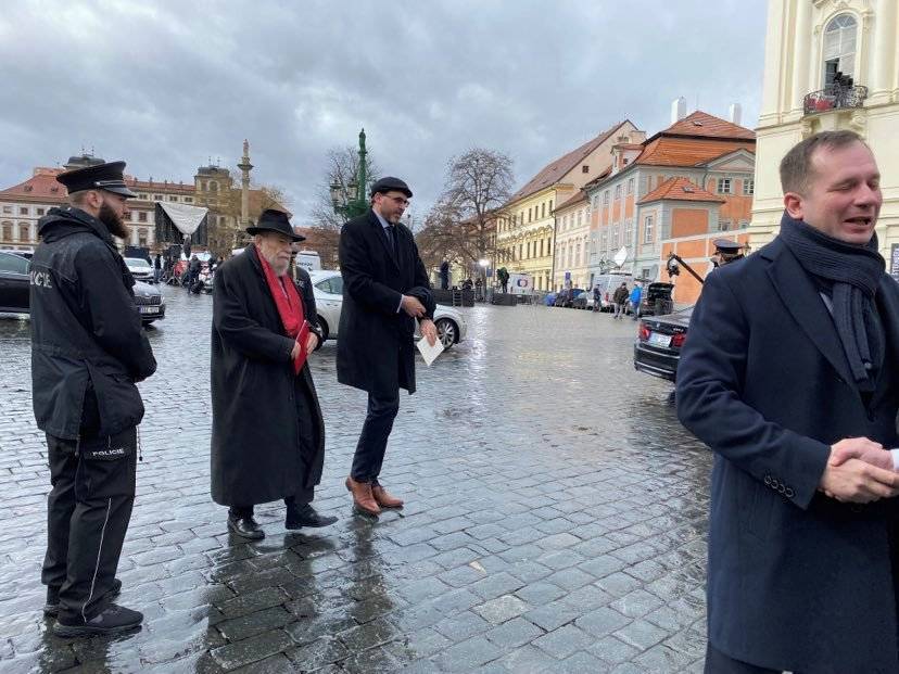 Vrchní zemský rabín Karol Sidon s doprovodem míří přes Hradčanské náměstí na inauguraci.