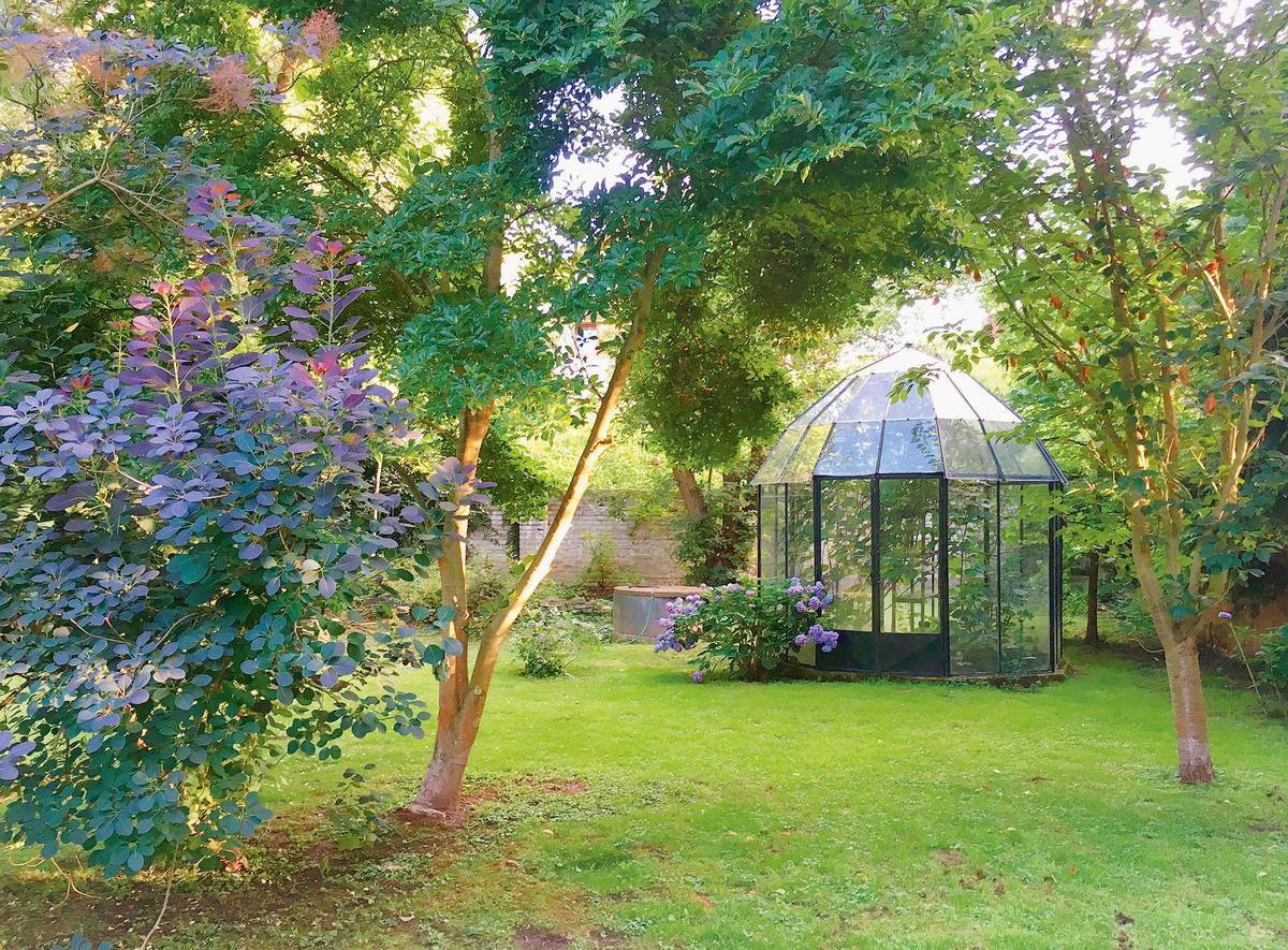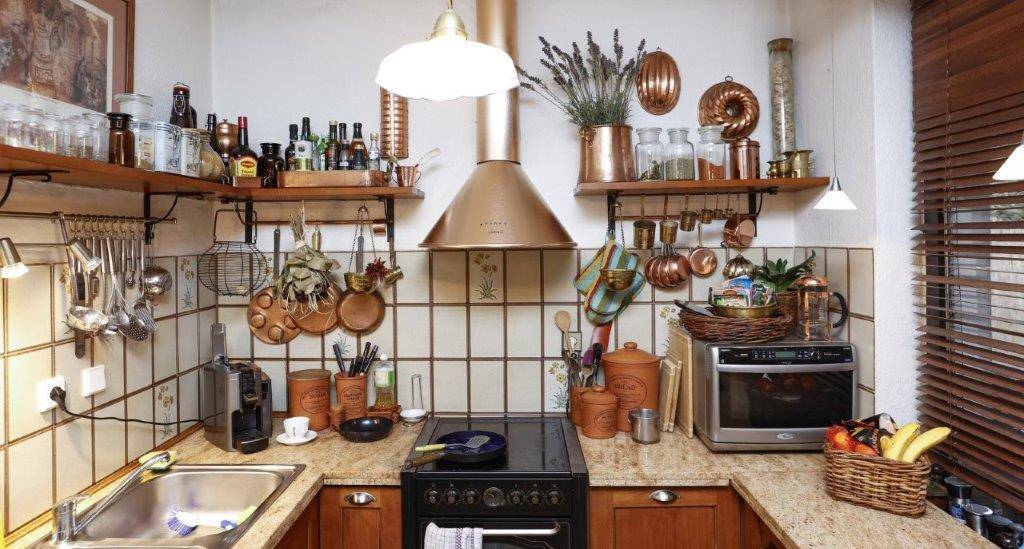 Kuchyně s měděným nádobím a s jídelním stolem je opravdovým srdcem domu s výhledem do zahrady.