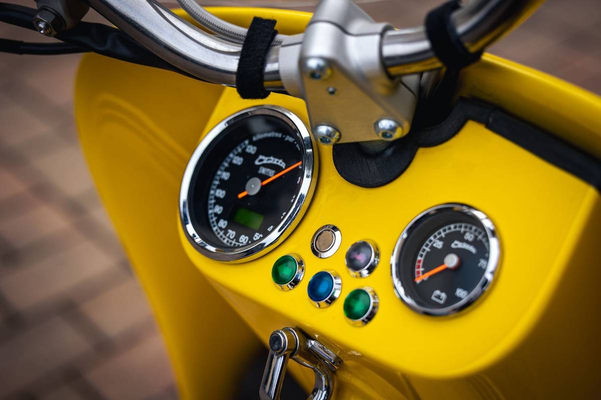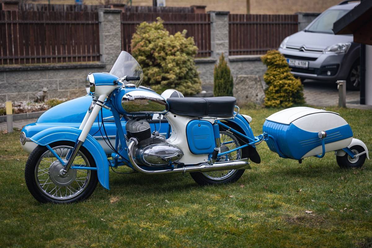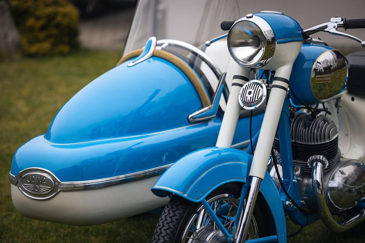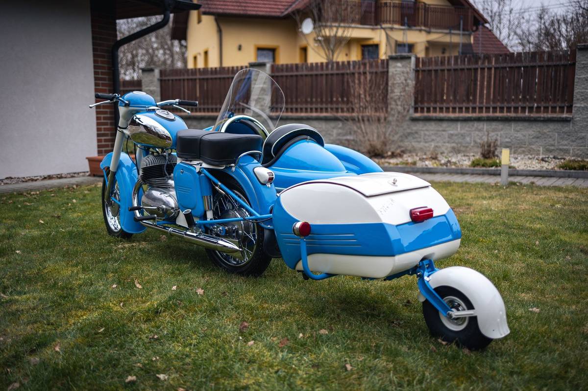 Ojedinělá Jawa "Panelka" v exportním provedení pro obchodní řetězec Neckermann s typickými prvky nadstandardní výbavy, jako jsou blinkry v řídítkách nebo specifické zadní světlo.