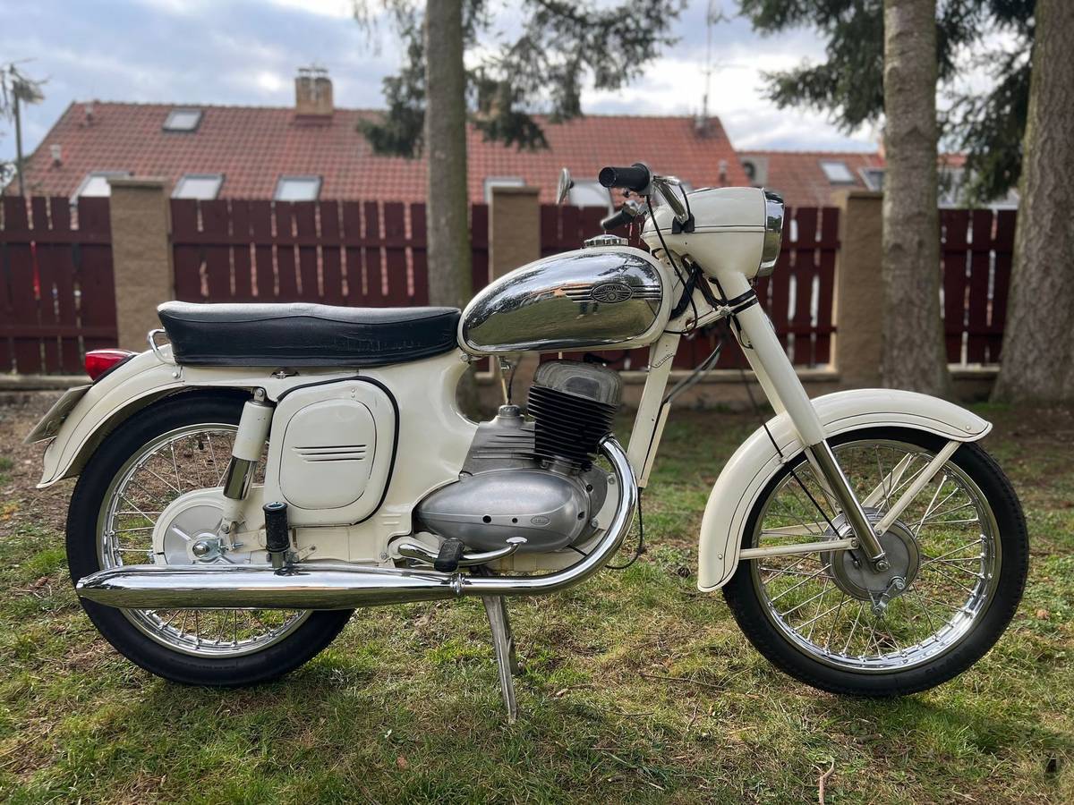 Bílá Jawa 250/590, které se díky známé písni od Věry Špinarové říká "Špinarka".