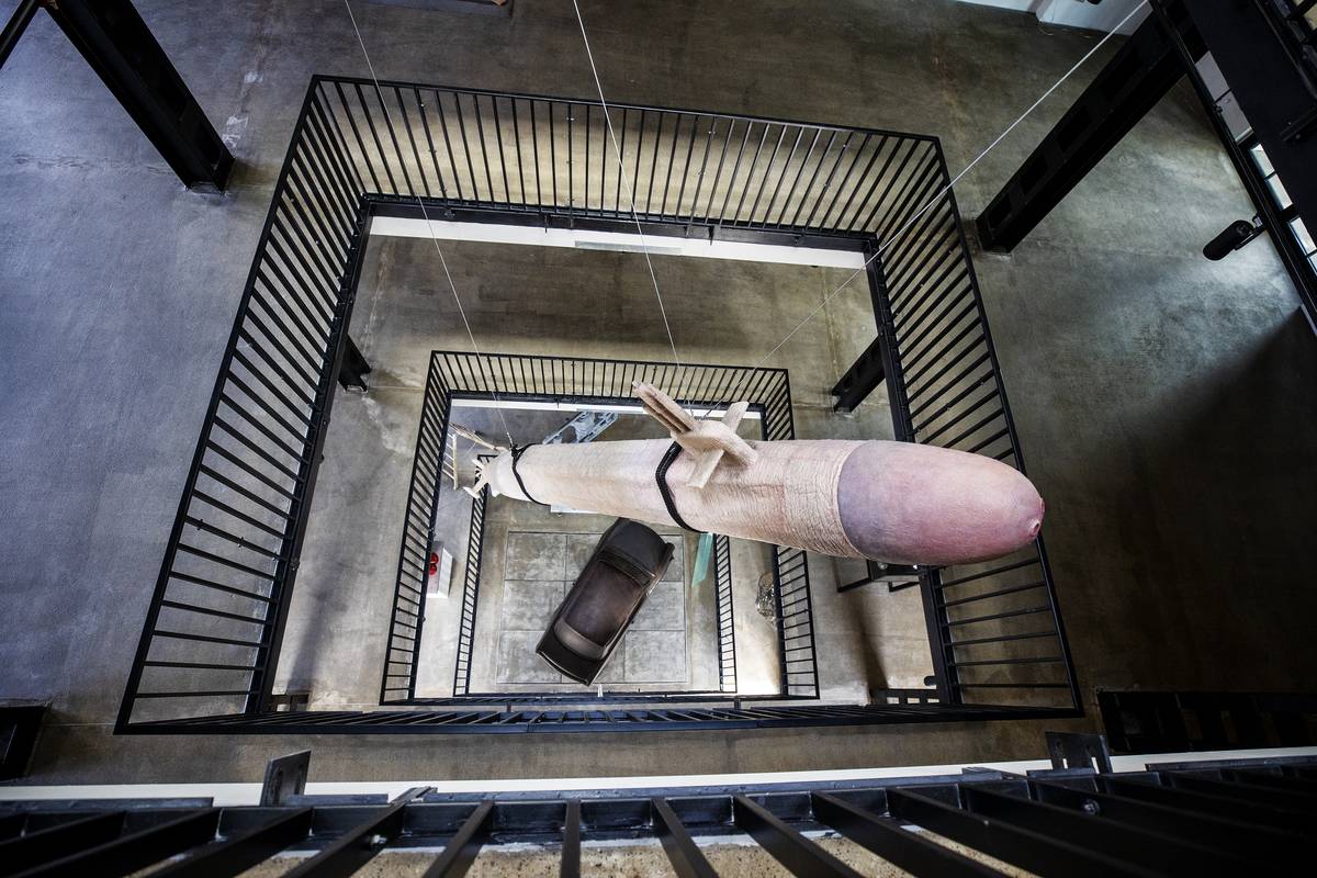 Atrium vyplňuje obří penisoponorka. David Černý ji v minulosti vystavil v DSC Gallery spolu s dalšími erotickými motivy.