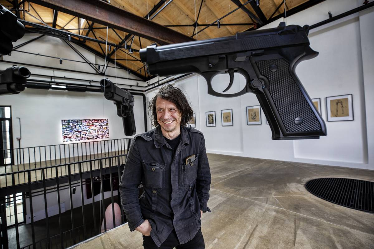 David Černý stojí pod plastikami čtyř obřích pistolí, které v minulosti visely v New Yorku nebo ve Valašském Meziříčí.