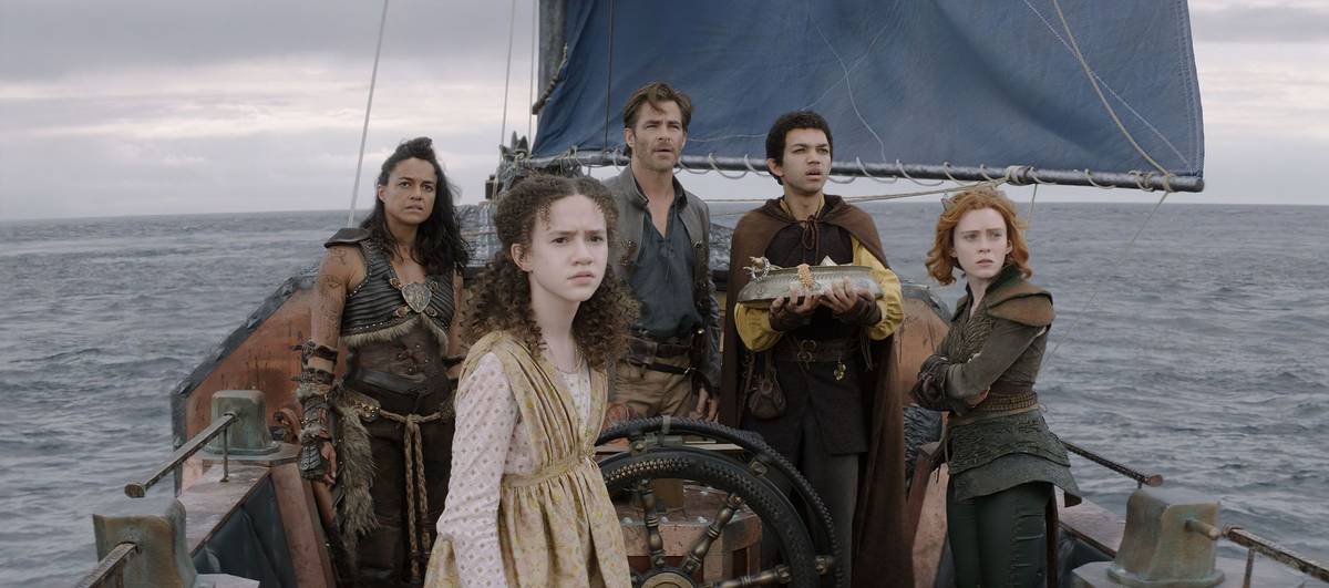 Michelle Rodriguezová jako Holga, Justice Smith coby Simon, Chris Pine v roli Edgina a Sophia Lillisová jako Doric.