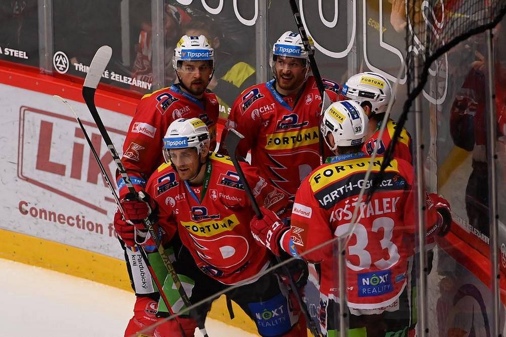 První gól Třince. Zleva autor gólu Libor Hudáček, překonaný brankář Pardubic Roman Will, Ondřej Vála z Pardubic a Vladimír Dravecký z Třince.