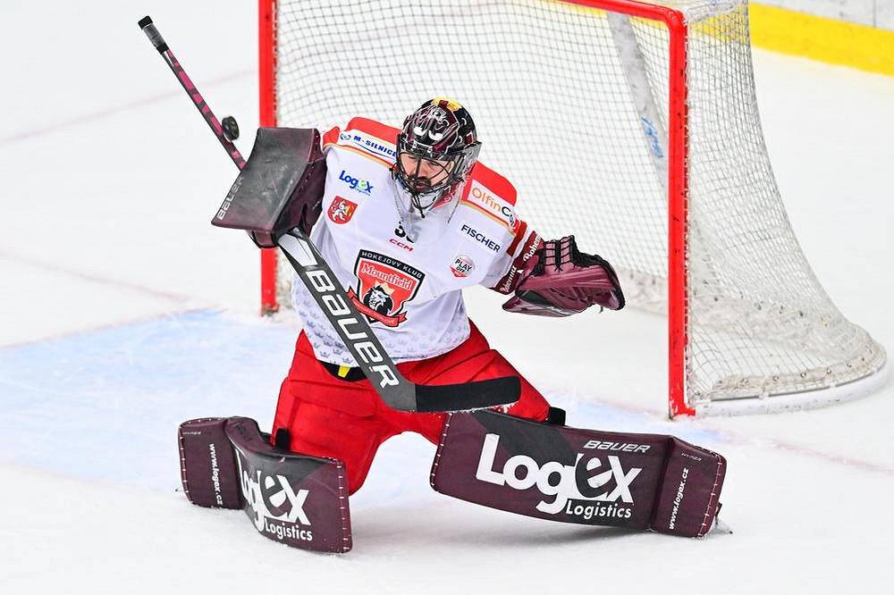 Brankář Hradce Králové Matěj Machovský zasahuje.