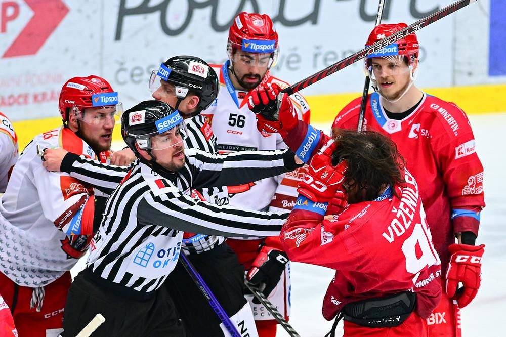 Zleva Martin Marinčin a Adam Smith z Třince, Oliver Okuliar z Hradce Králové a Marko Daňo z Třince.