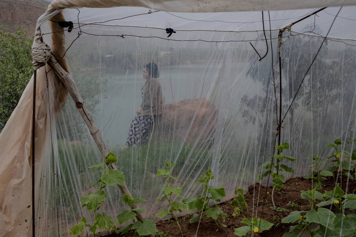 Obyvatelka vesnice Istiqlol v Tádžikistánu odpočívá u svého skleníku na řece Vachš.