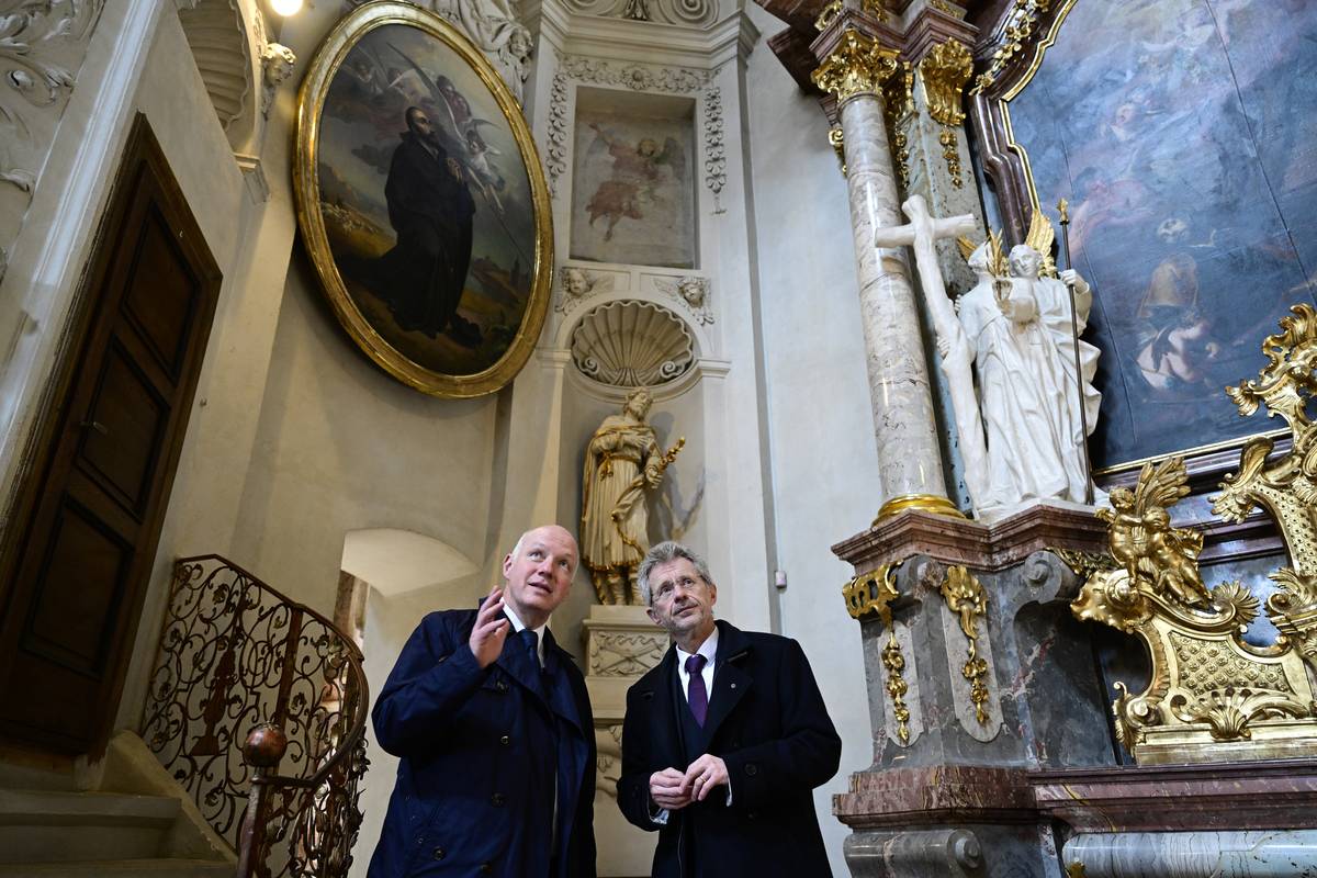 Senátor Pavel Fischer (vlevo) a předseda Senátu Miloš Vystrčil na posledním rozloučení s Danou Němcovou.
