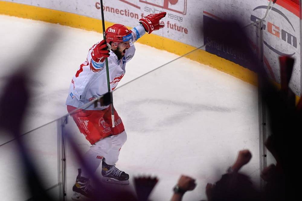 Třinecký útočník Libor Hudáček se raduje z rozhodující trefy na 2:1 v 6. finále extraligy proti Hradci králové.