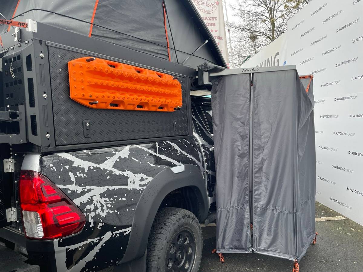 Výbavě se meze nekladou, Hilux upravený od firmy Alu-cab má také venkovní sprchu a samozřejmě vyprošťovací podložky.