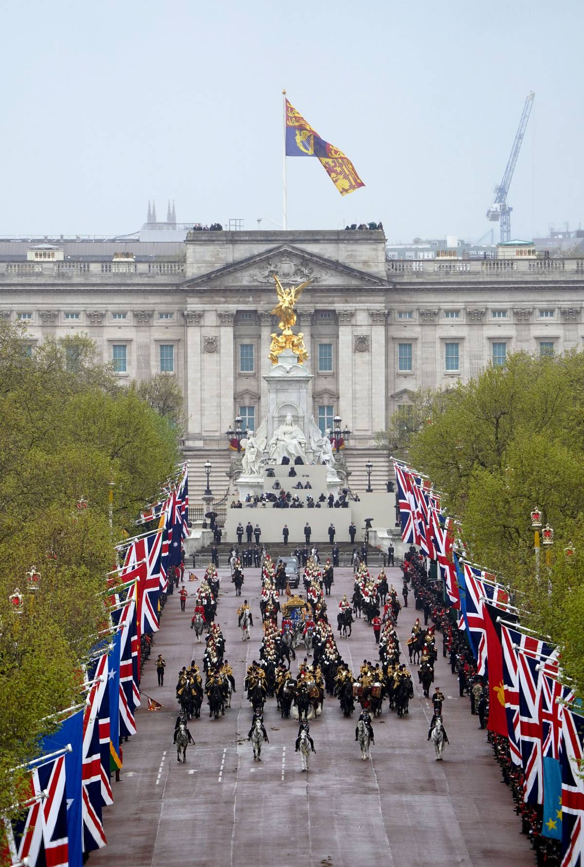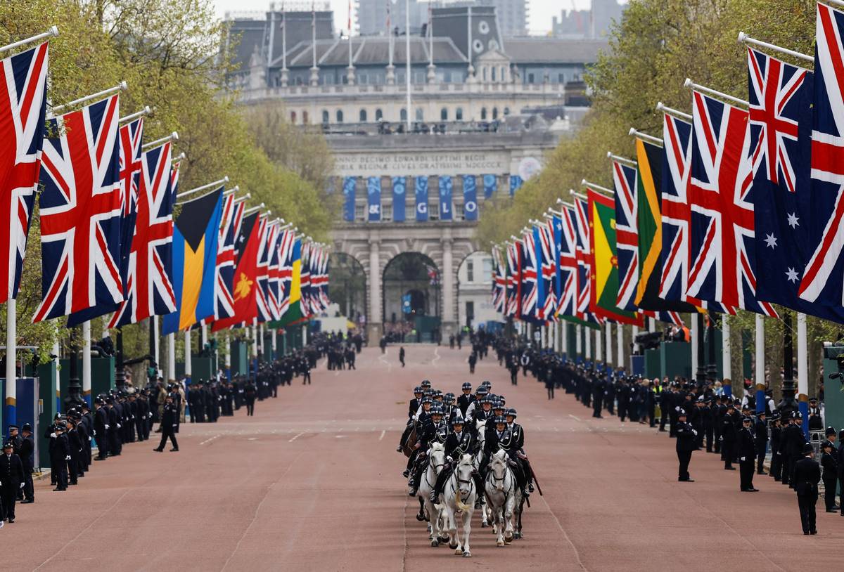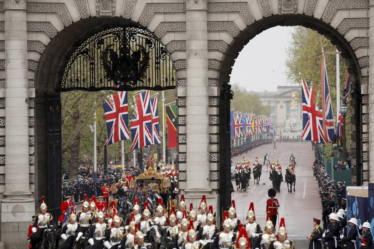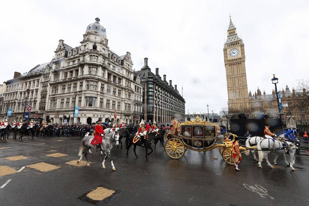 Král Karel přijíždí se svojí eskortou do Buckinghamského paláce, aby se připravil na slavnostní průvod