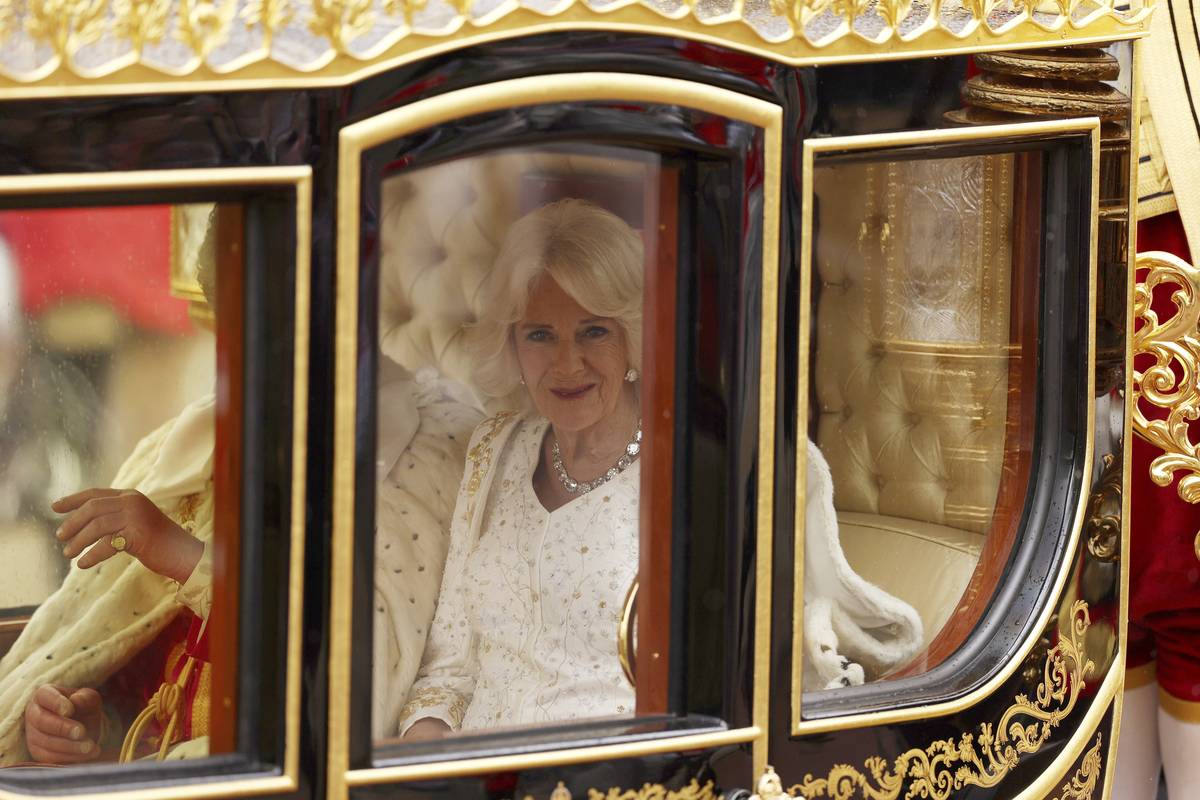 Královna Camilla v kočáře mířícím na korunovaci. Camilla má na sobě roucho, které bylo vyrobeno pro zesnulou královnu Alžbětu II.
