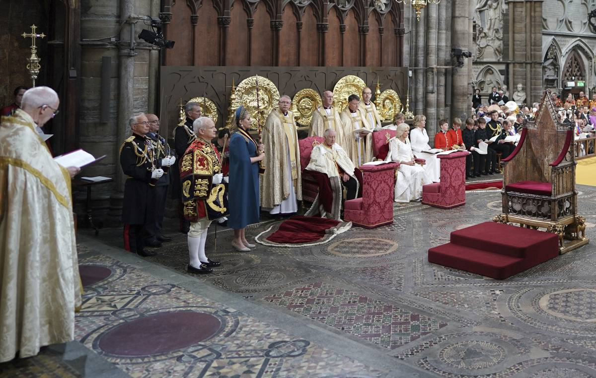 Britský král Karel III. a královna Camilla během jejich korunovačního ceremoniálu ve Westminsterském opatství v Londýně