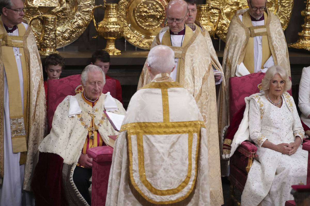 Král Karel s chotí Camillou během korunovačního obřadu