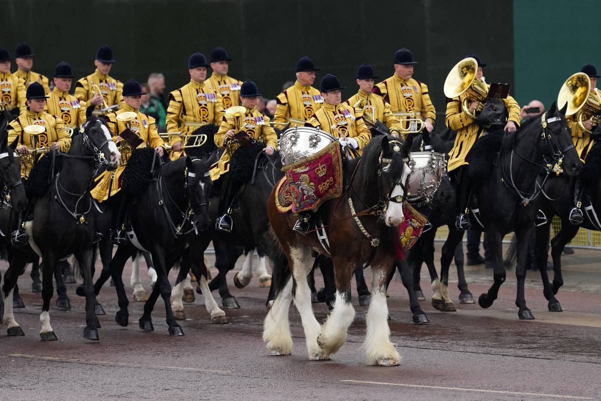 Vojenská kapela na koni vyjíždí před Buckinghamským palácem před britským korunovačním ceremoniálem krále Karla III.