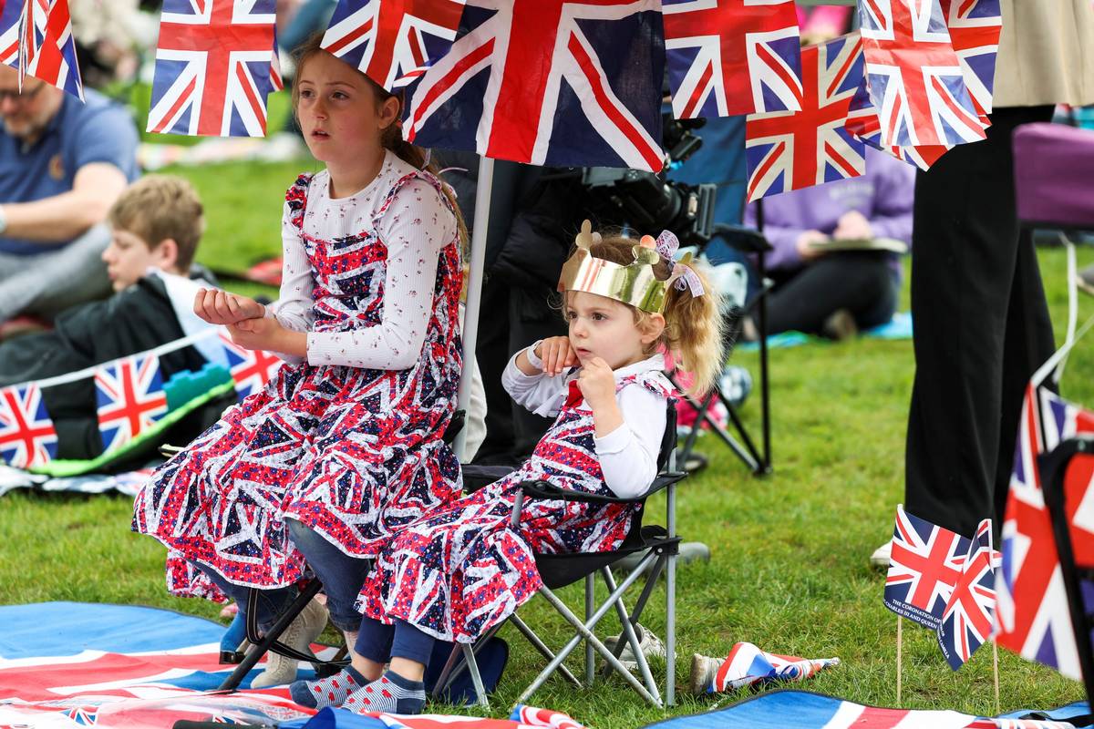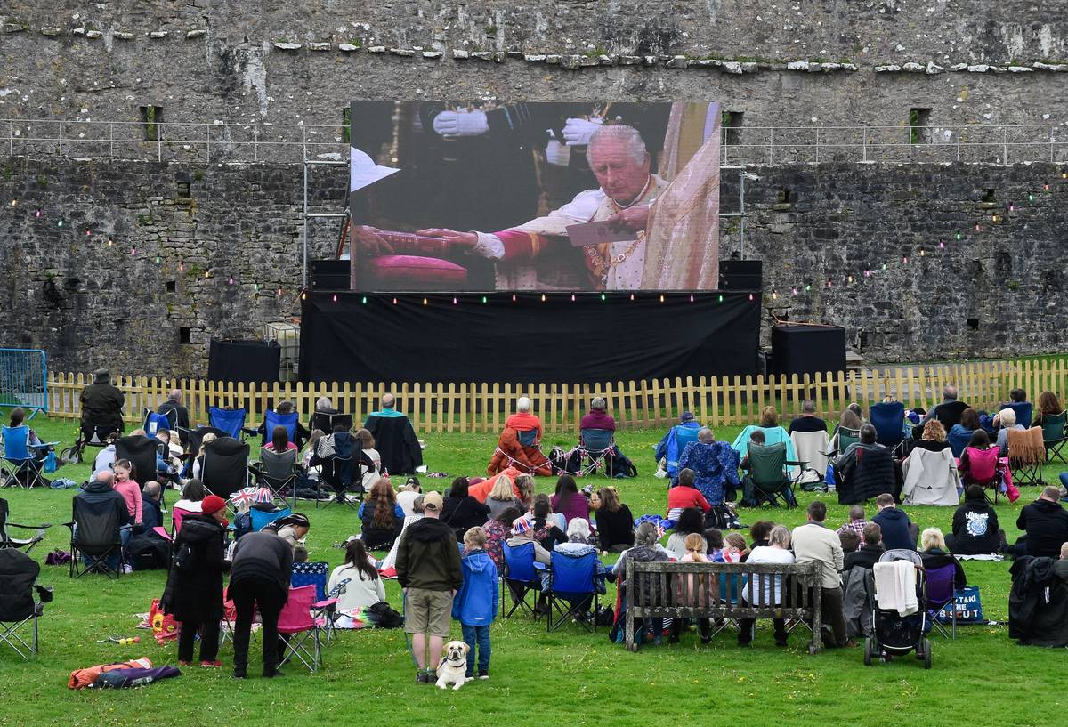 Lidé sledují obřad korunovace britského krále Karla a královny Camilly na zámku Pembroke ve Walesu