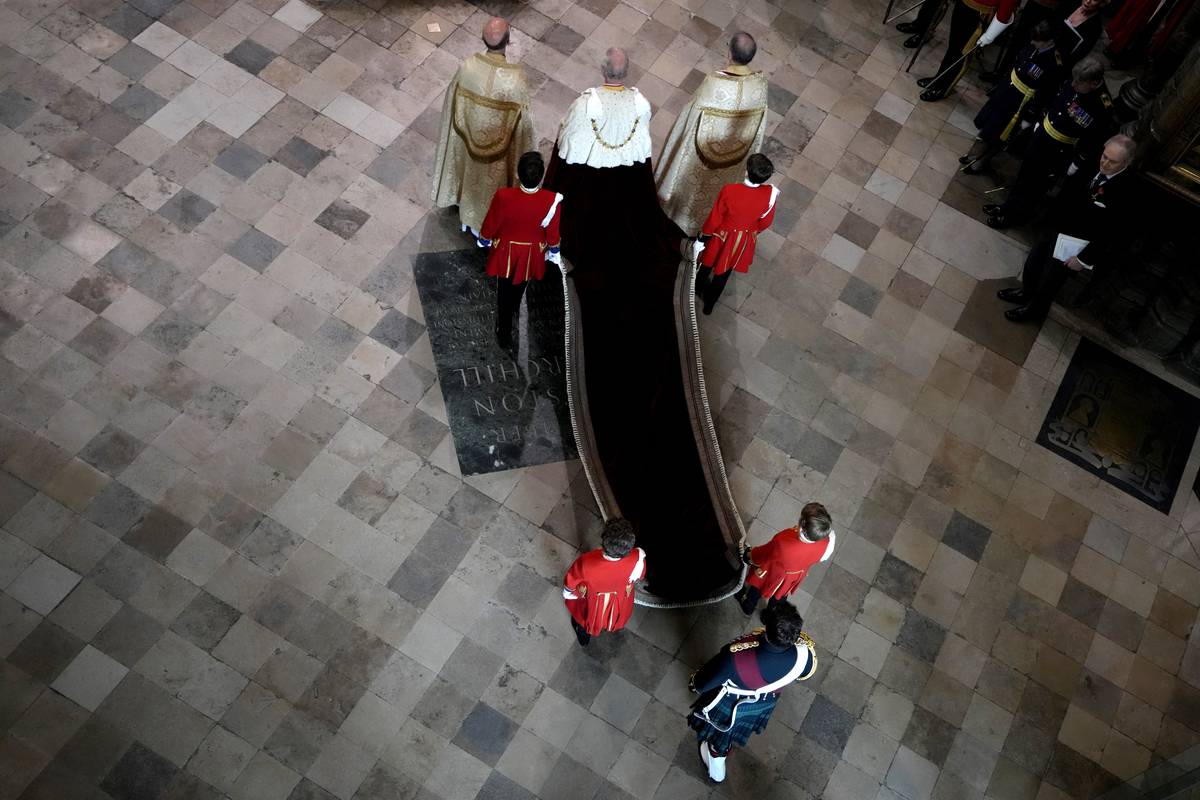 Čtyři pážata drží plášť krále Karla ve Westminsterském opatství. Jedním z pážat je králův vnuk, princ George