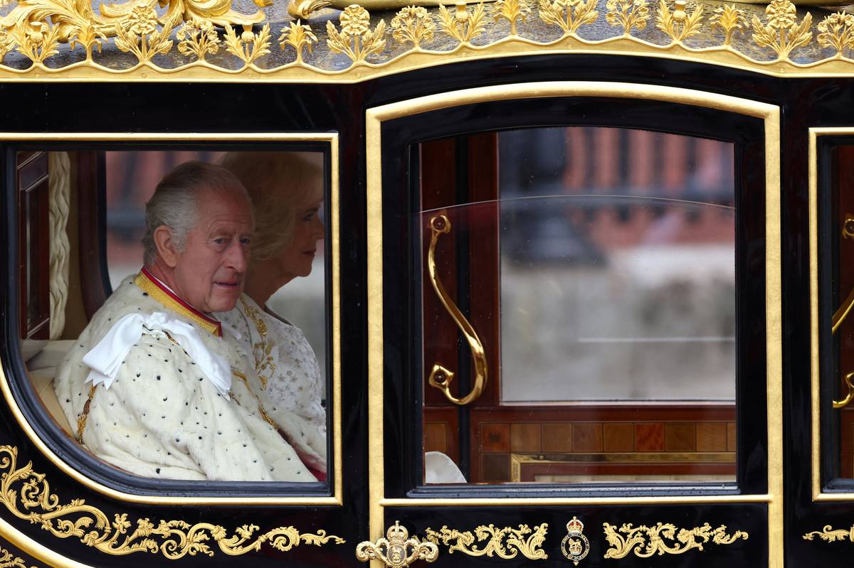 Král Karel s chotí Camillou jeli do Westminsterského opatství v tzv. Diamond Jubilee Coach (diamantový výroční kočár), který byl vyroben u příležitosti královniných 80. narozenin