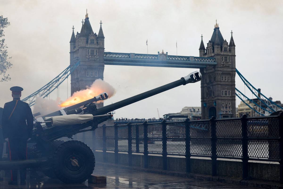 Vypálení z děl u mostu Tower Bridge během korunovačního ceremoniálu