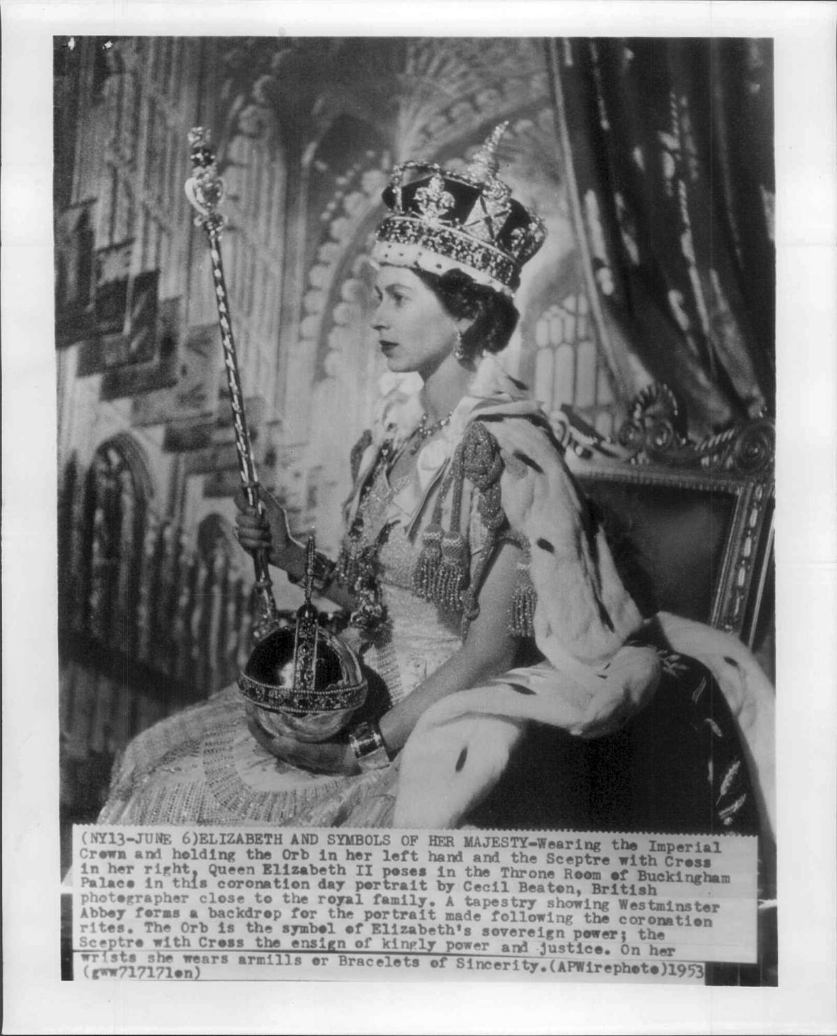 Koruna sv. Edwarda, oficiální koruna Anglie, na snímku z listopadu 1952 v Tower of London, předtím než byla použita při korunovačním ceremoniálu královny Alžběty II., 5. června 1953. Vzhledem k jejímu významu jako ústřednímu prvku korunovace to bude jediná chvíle za jeho vlády, kdy panovník bude nosit korunu ze zlata s purpurovou sametovou čepicí, hermelínovým páskem a překříženými oblouky zakončenými křížem
