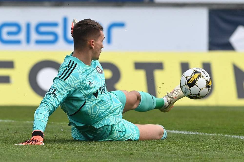 Gólman Sparty Matěj Kovář v akci během utkání 1. kola nadstavby ve skupině o titul na hřišti Sigmy Olomouc.