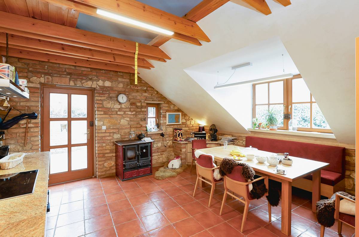 Do svahu je šikovně zapuštěna i letní kuchyně s posezením i pískovištěm pro nejmladšího synka.