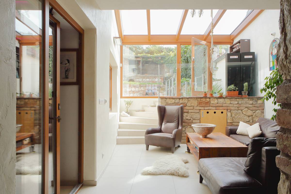 Zimní zahrada je příjemné místo na posezení hned vedle studia. Hranice mezi soukromím rodiny a přítomných muzikantů je zřejmá, ale není přísně „střežená“.
