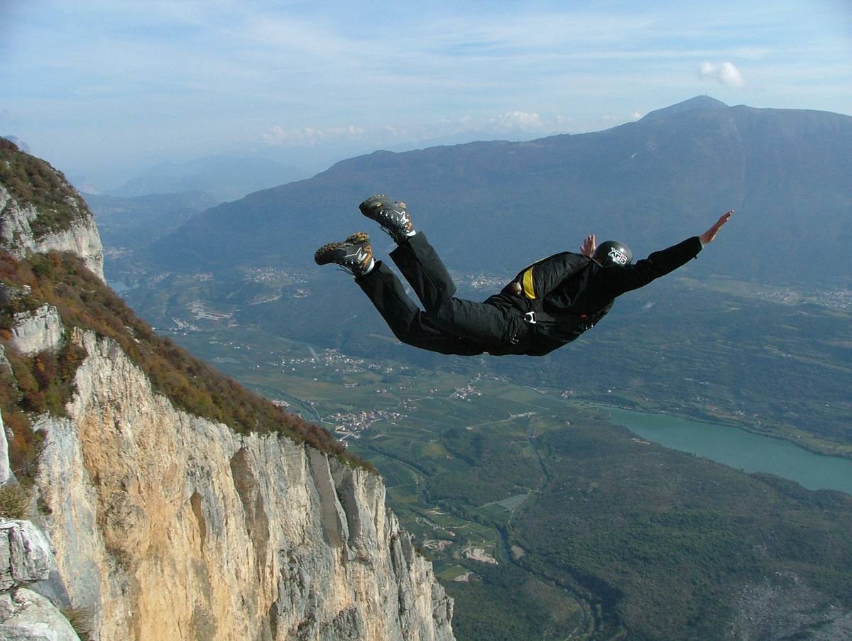 Skok ze skály Monte Brento v Itálii