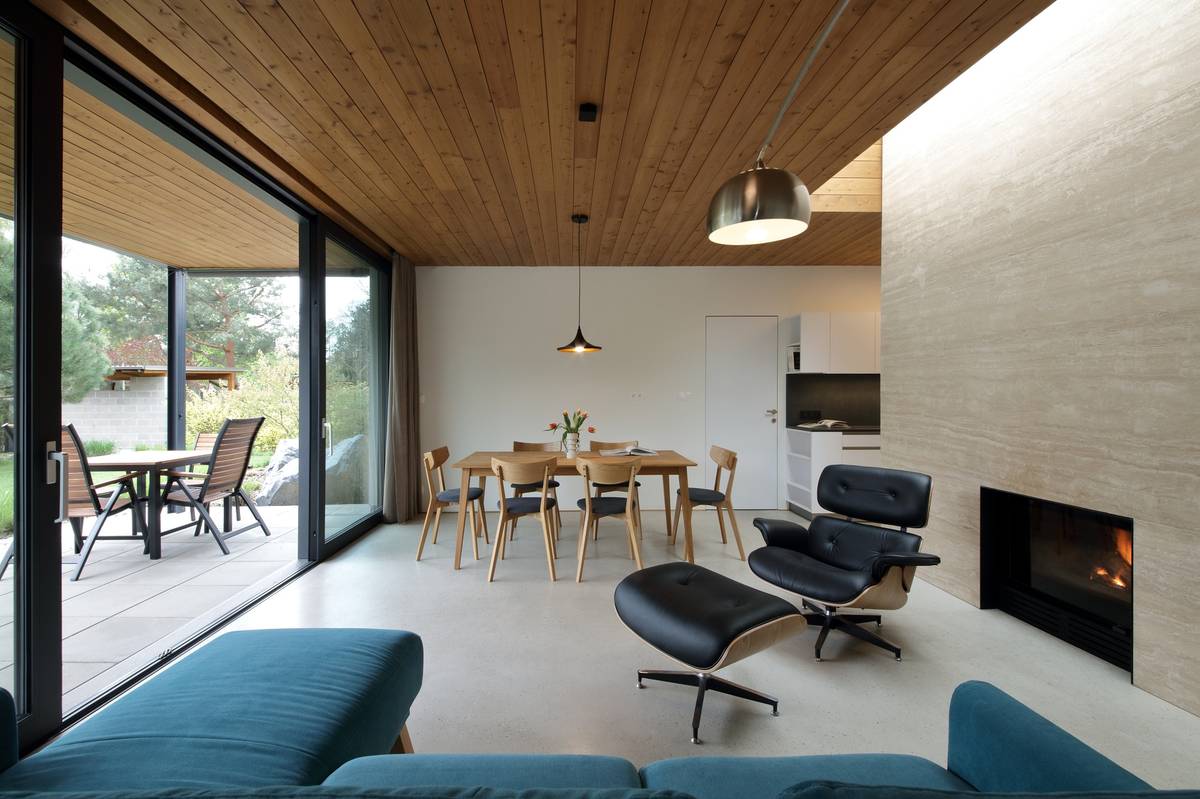 V obývacím pokoji není žádná nábytková stěna, jen prosklená zeď s výhledem do zahrady.