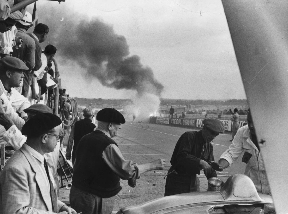V 35. kole odbočil jezdec Hawthorn na Jaguaru do boxů, Macklin s Austinem Healey se mu snažil vyhnout, ale narazil do Mercedesu 300SLR, který pilotoval Pierre Levegh. Mercedes se vznesl do vzduchu a dopadl mezi diváky, vzňal se a způsobil smrt více než 80 lidí, 200 utrpělo zranění. (Na snímku smrtelná nehoda Pierra Levegha 11. června 1955.)