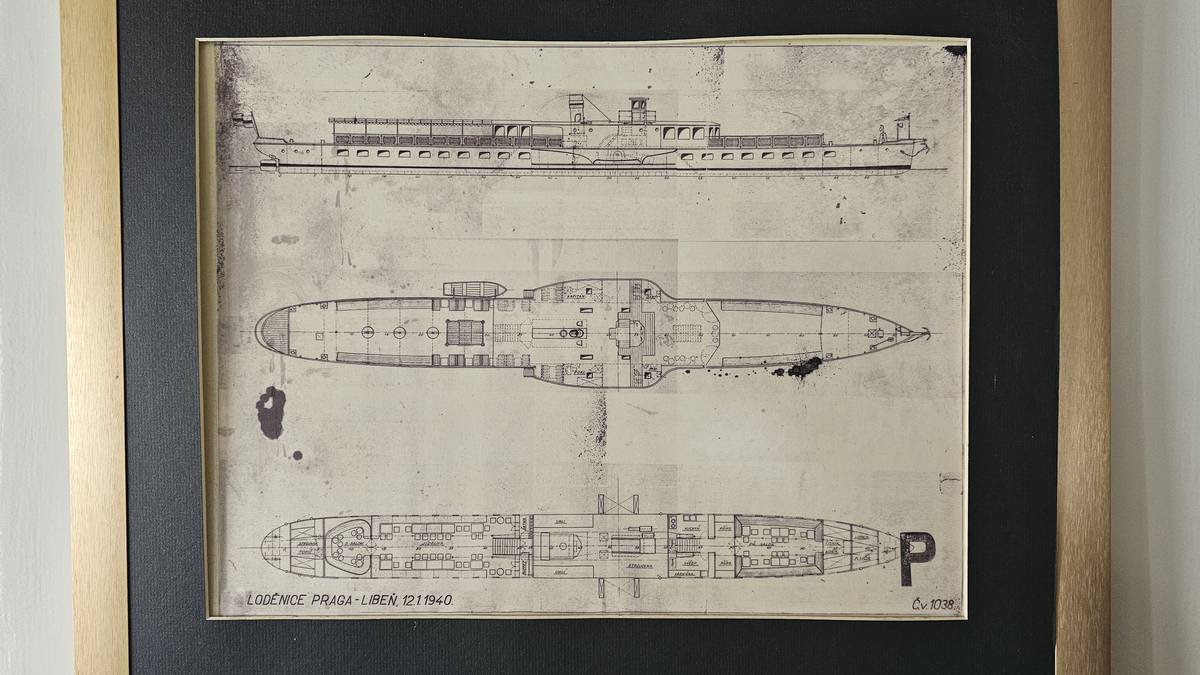 Jeden z obrázků na parníku je i tento plánek lodi.