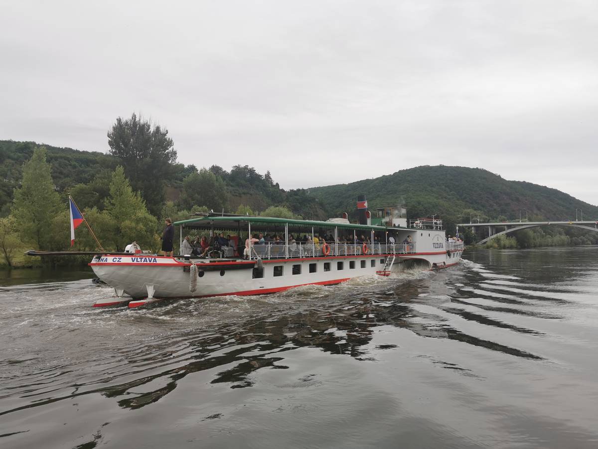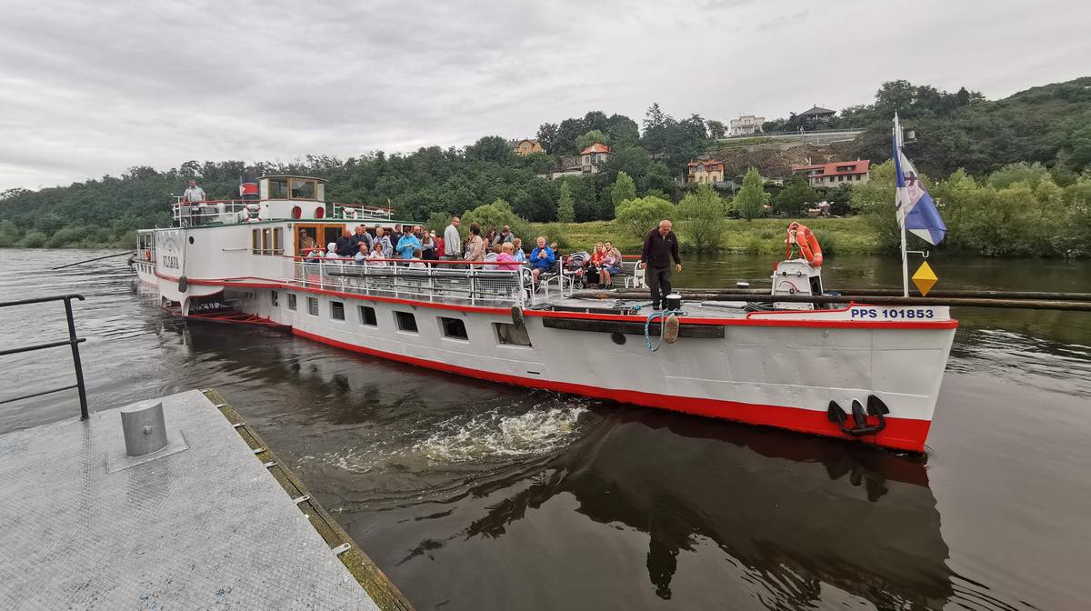 Parník Vltava odplouvá ve směru na Slapy z pražské Zbraslavi, která je jednou ze zastávek, kde mohou cestující nastoupit nebo vystoupit.