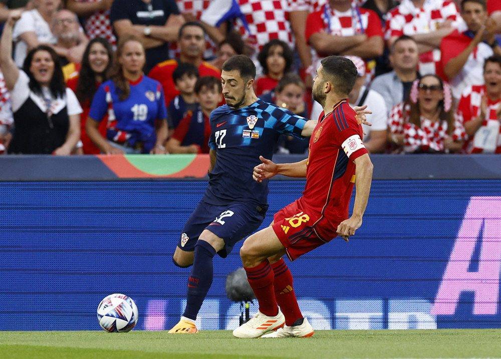 Chorvat Josip Juranovič (vlevo) a Španěl Jordi Alba ve finále Ligy národů.