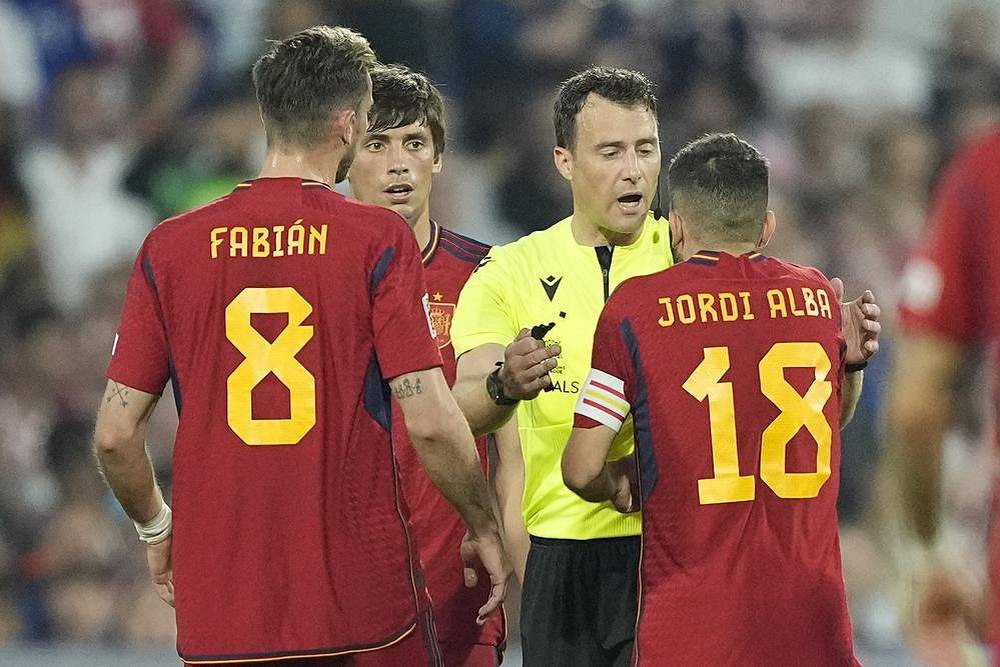 Rozhodčí Felix Zwayer mluví se Španělem Jordim Albou během finále Ligy národů.