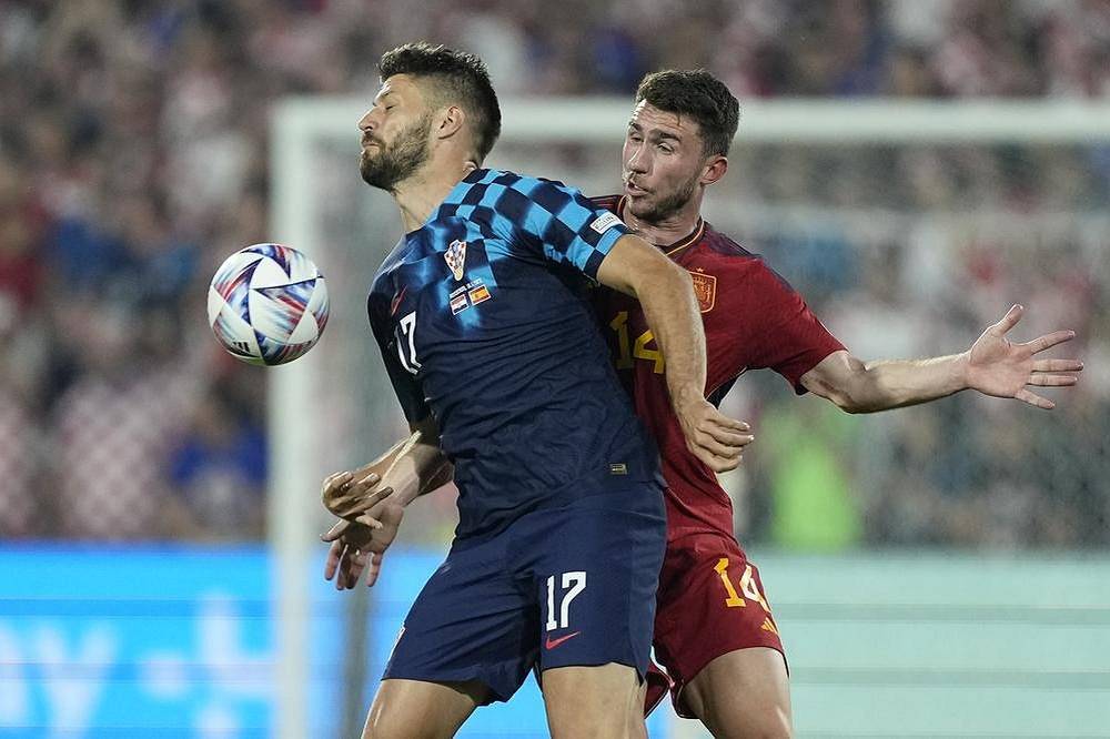 Chorvat Bruno Petkovič (vlevo) a Španěl Aymeric Laporte během finále Ligy národů.