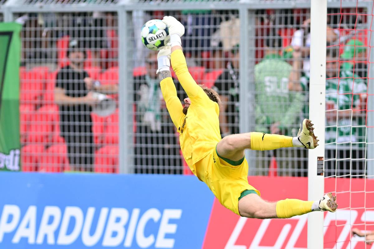 Brankář Michal Reichl z Bohemians při zákroku v duelu s Pardubicemi.