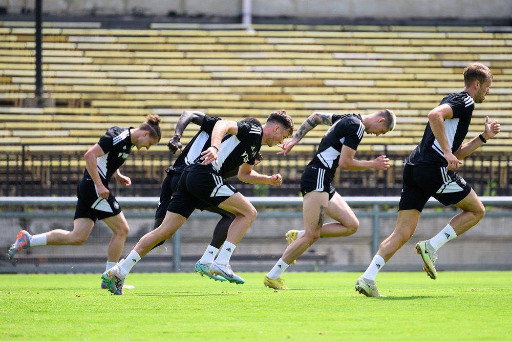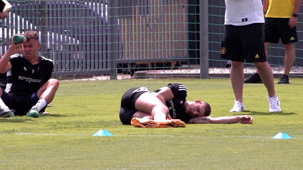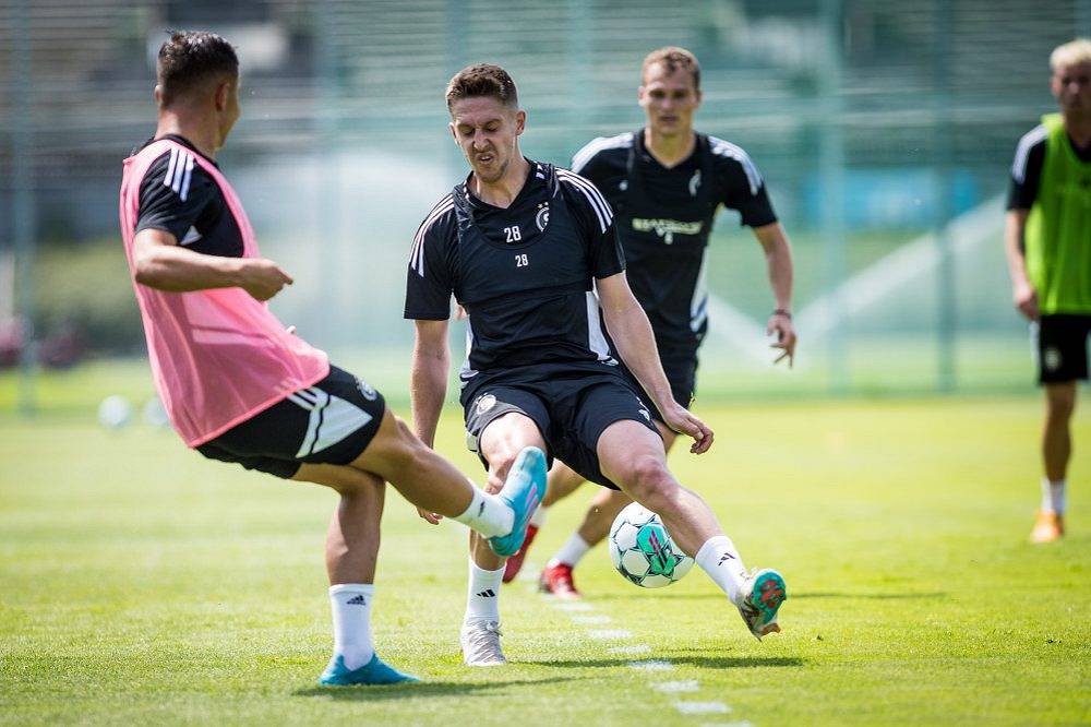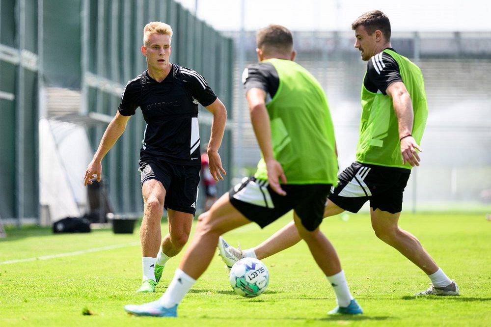 Kondiční trenér Tomáš Malý a Casper Hojer během prvního tréninku v rámci letní přípravy před startem sezony 2023/2024.