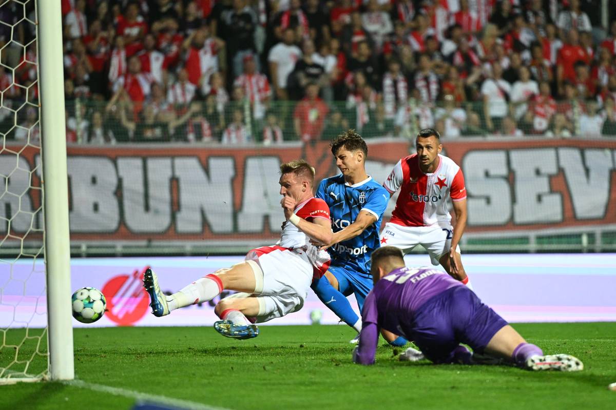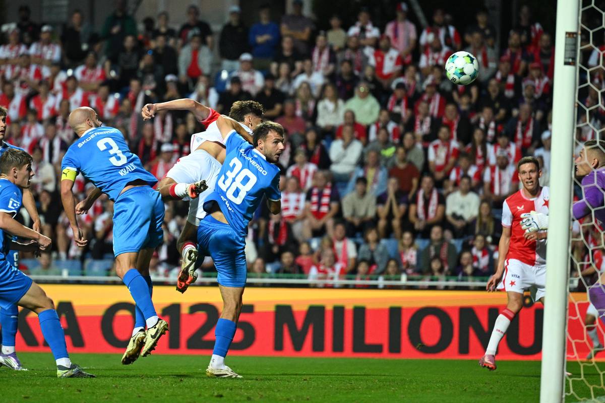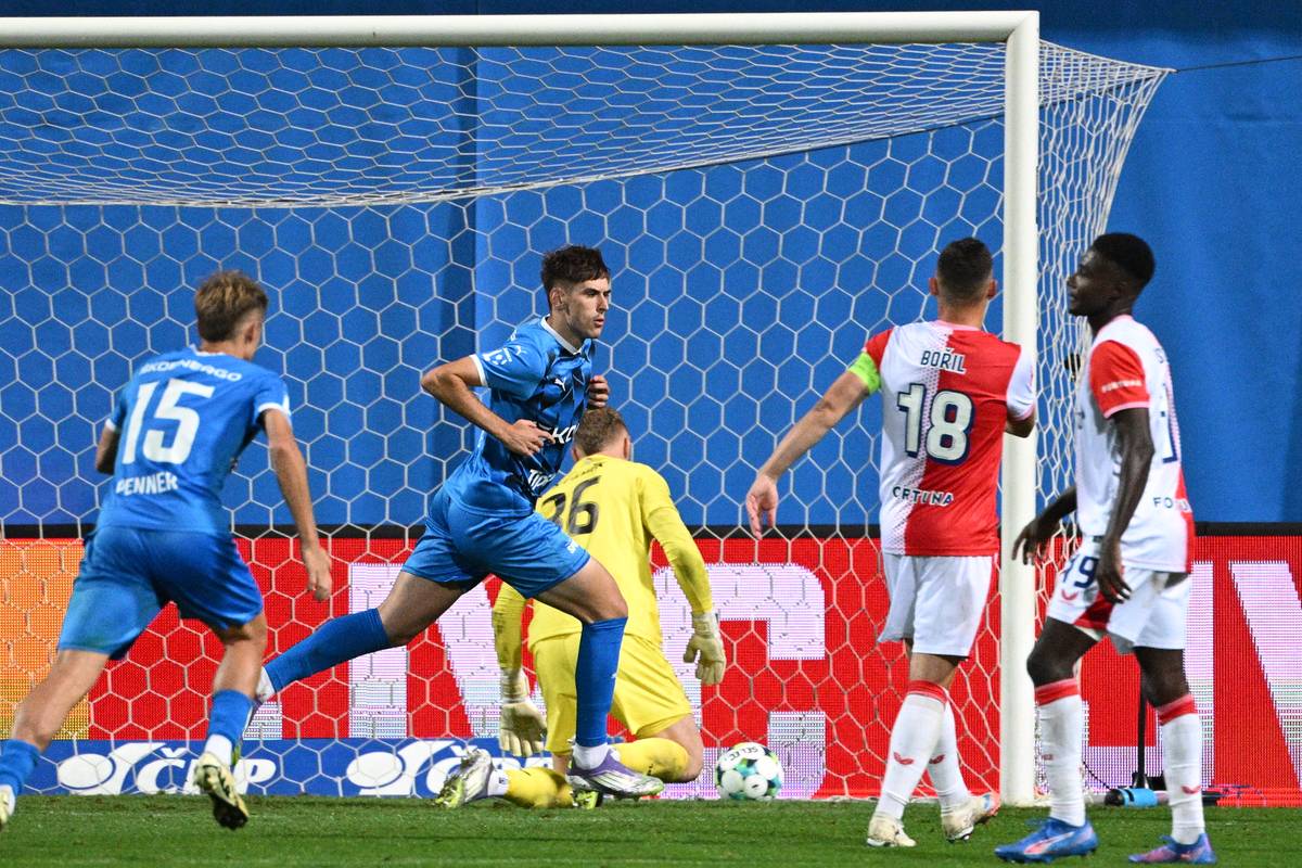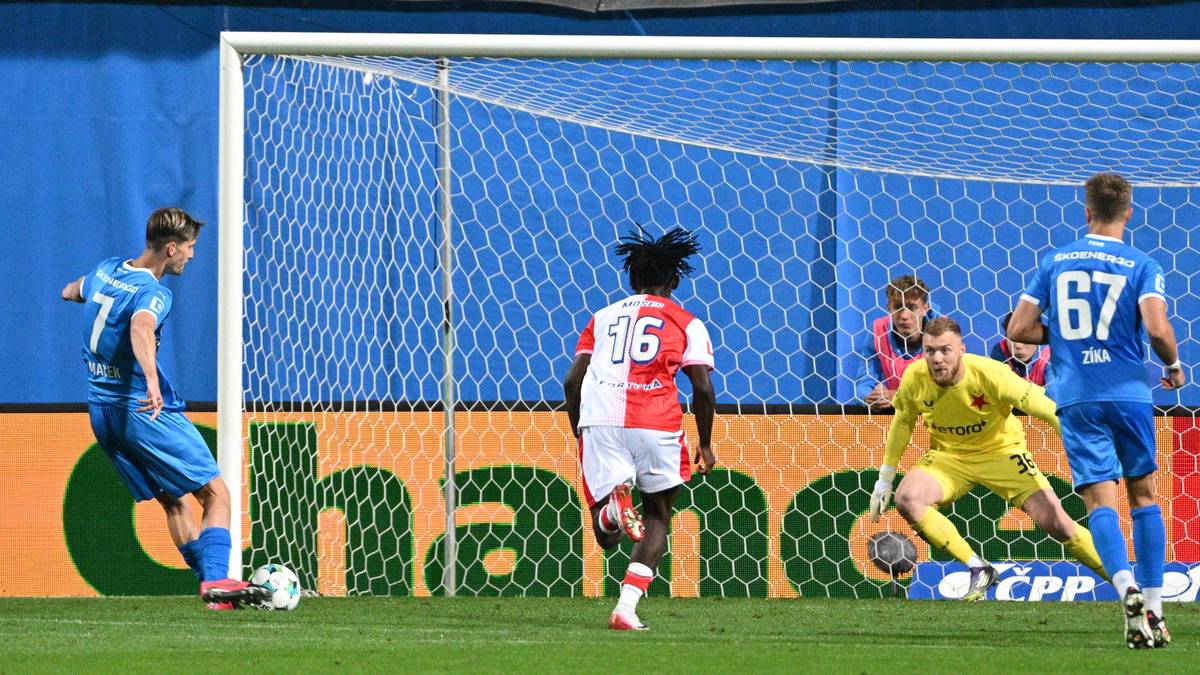 Stoper Slavie Štěpán Chaloupek střílí skluzem gól.