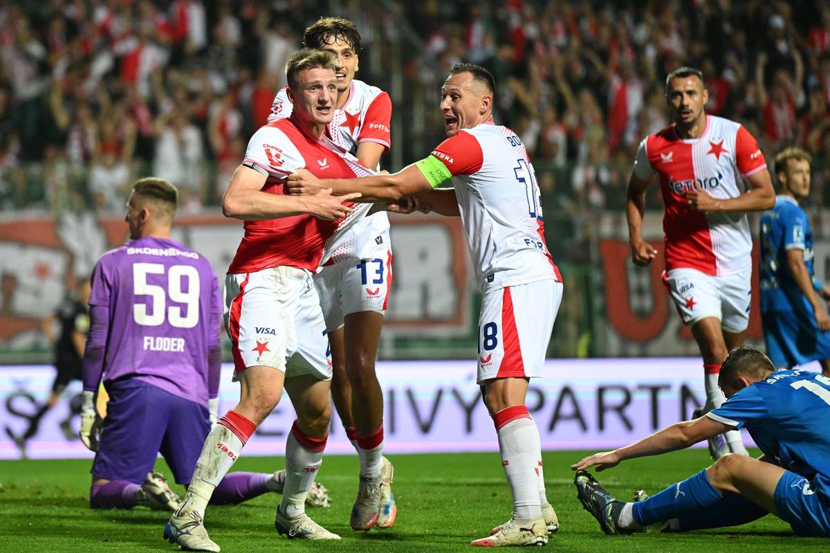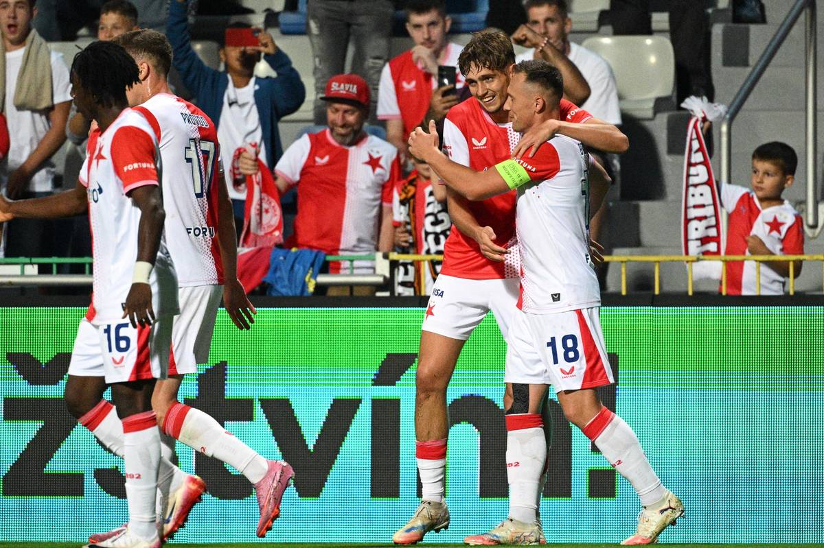 Radost fotbalistů Slavie z druhé trefy do sítě Mladé Boleslavi.