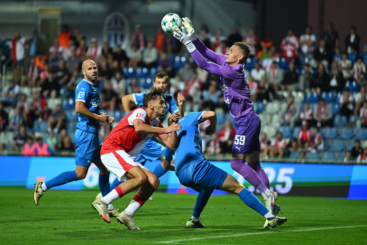 Brankář Matouš Trmal z Teplic inkasuje v Karviné první branku.