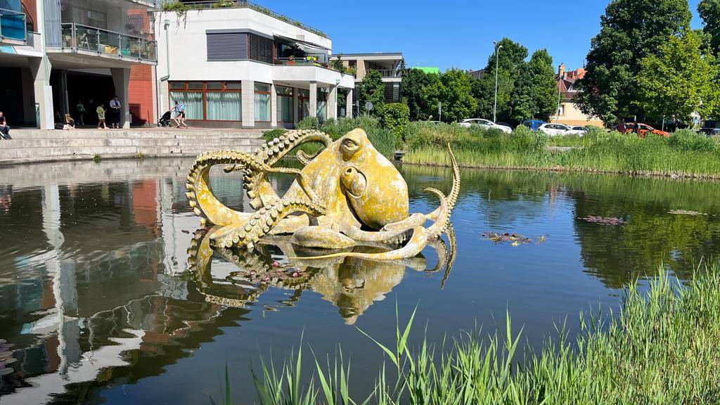 Socha Chobotnice od Viktora Paluše hlídá jezírko u náměstí v Dolních Břežanech.