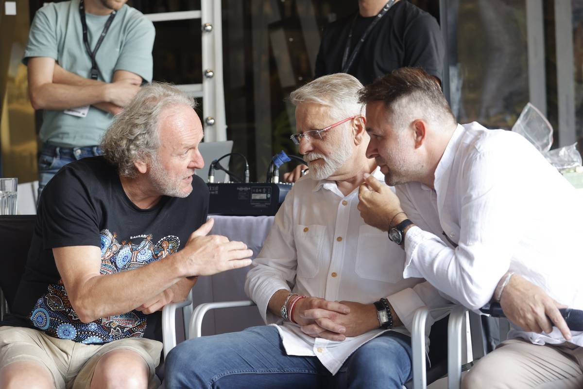 Film Dana Svátka Dvě slova jako klíč byl představen na MFF . Na snímku herec Jaroslav Dušek a scenárista, spisovatel Josef Formánek a režisér filmu Dan Svátek.