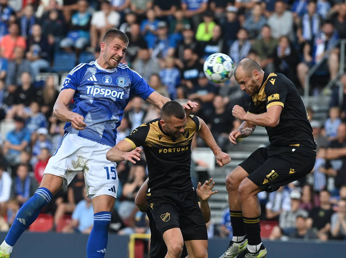 Ostravský David Lischka bojuje v krkolomné pozici o míč se Simionem Michezem ze Sigmy Olomouc.