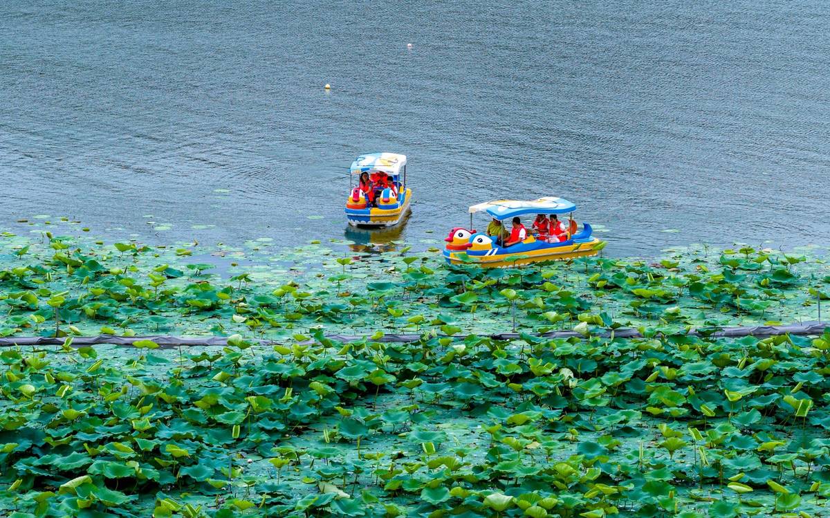 Na jezeře si lze půjčit lodičku a projet se mezi kvetoucími lotosy.