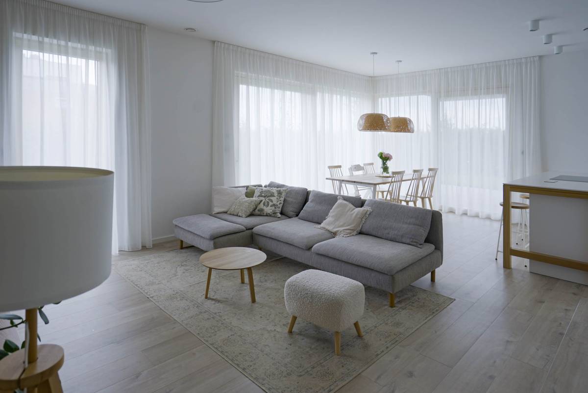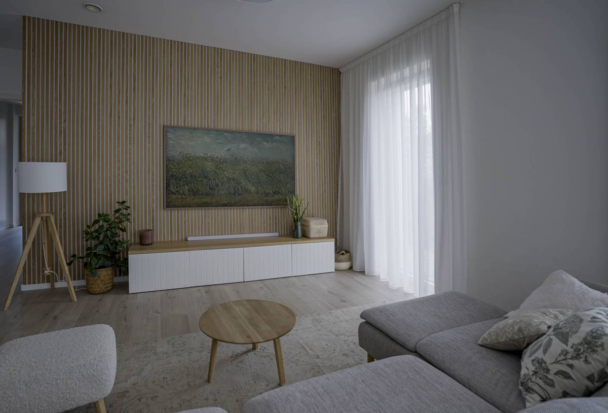 Interiér je hezky zařízený. Ve světlých barvách a s důrazem na přírodní materiály